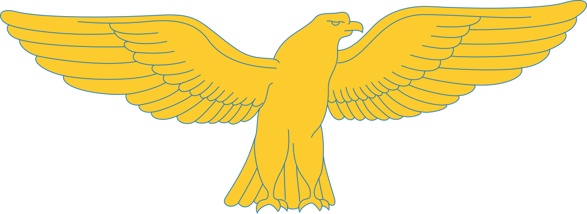This features a large, golden eagle with its wings spread wide. The bird is perched on top of a yellow background, giving it an impressive and majestic appearance. Its wings are open, showcasing the intricate details of its feathers. The eagle's beak is slightly bent, adding to its dynamic pose. This image captures the beauty and power of this magnificent bird in all its glory.
