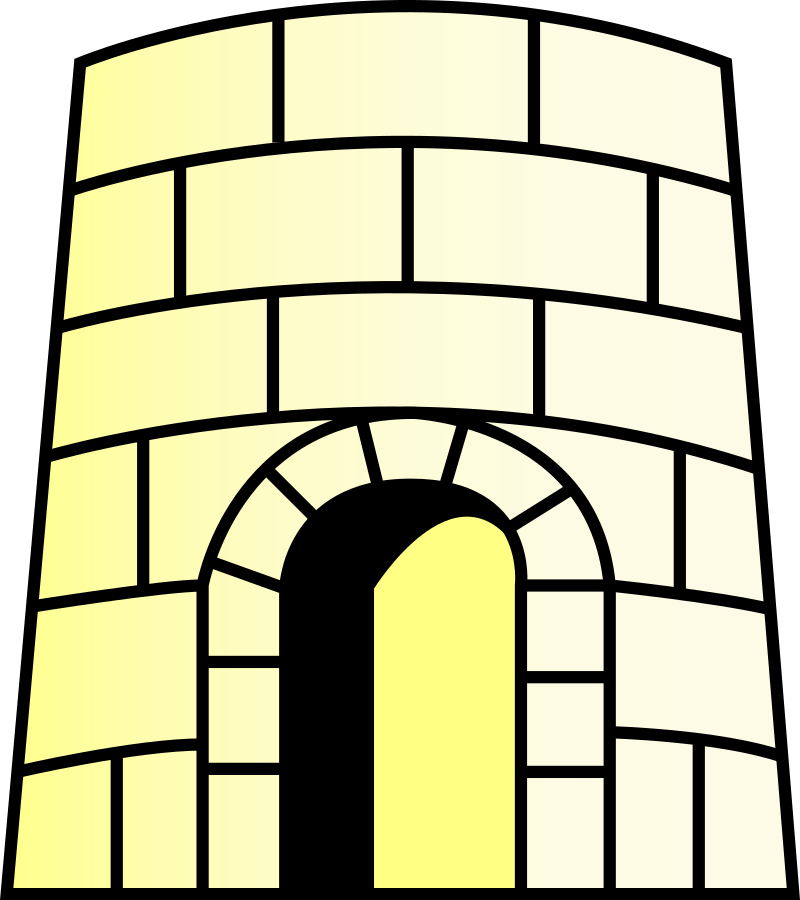 This features a large brick tower with an arched doorway. The doorway is open, inviting viewers to enter the tower. The tower has a unique design, resembling a castle or a stone building. The archway is made of bricks and stands out as the main focal point in the scene. The overall appearance of the image gives off an impression of a historical structure that has been preserved over time.