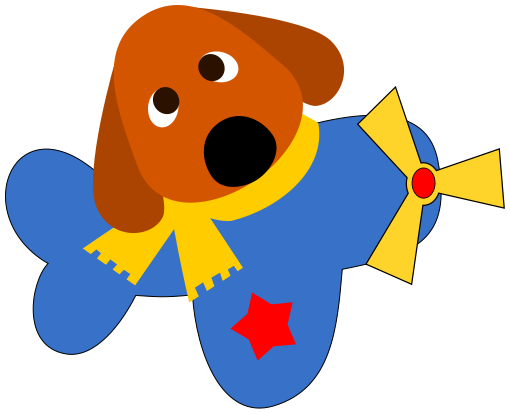 This features a cartoon dog wearing a blue shirt and yellow scarf. It is holding onto a toy plane with a yellow propeller on it, giving the impression that the dog is flying in the air. The dog appears to be enjoying its time in the airplane, adding a playful element to the scene.