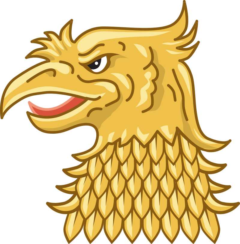 This features a golden bird with an angry expression, possibly a rooster. It has a large beak and is wearing a crown-like structure on its head. The bird's feathers are intricately designed, giving it a majestic appearance. Its eyes appear to be open wide, adding to the intensity of its expression. This unique design could represent a symbol or emblem for a specific group or organization.