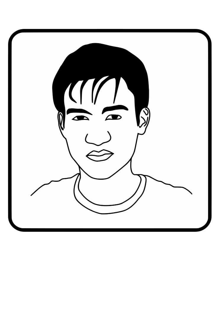 This features a black and white drawing of a man with short hair. He has a beard, and his lips are slightly parted as if he is speaking or smiling. His eyes are open, and the drawing captures his facial expression in detail. The man's head takes up most of the frame, indicating that this is the main focus of the image.
