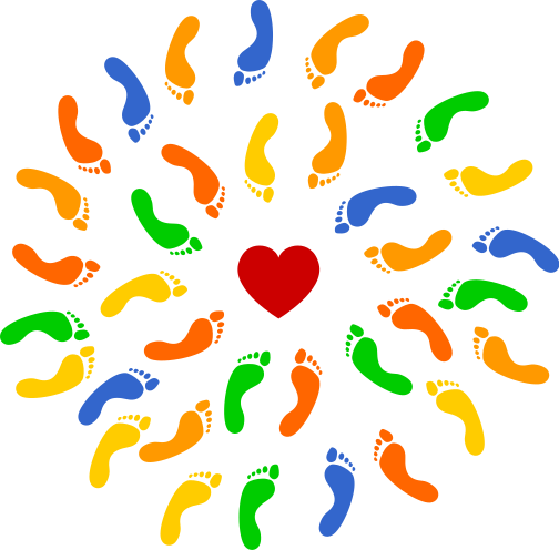 This features a large, colorful circle made up of various colored footprints. In the center of this circle is a red heart, which stands out against the vibrant background. The footprints are arranged in different colors and sizes, creating an eye-catching pattern that surrounds the heart. This unique design could be used for decorative purposes or as a creative way to express love and affection through art.