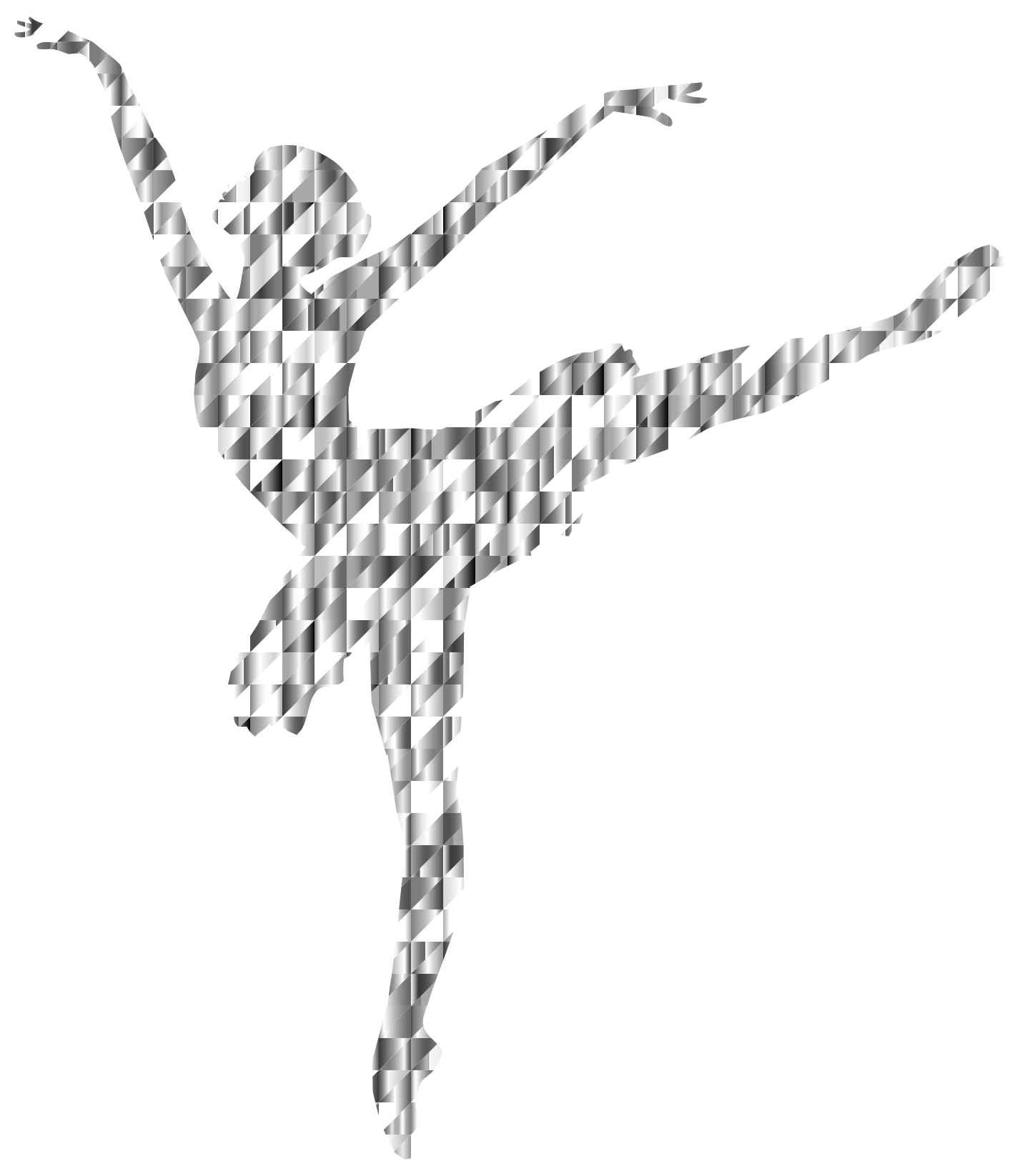 This features a black and white silhouette of a woman in a ballet pose. She is wearing a leotard, which is a common attire for dancers. Her arms are raised above her head, showcasing her graceful movements. The silhouette is created by the interplay of light and shadow, giving it an artistic appearance. The woman's body is positioned in such a way that she appears to be floating or suspended in mid-air, adding to the overall visual impact of the image.