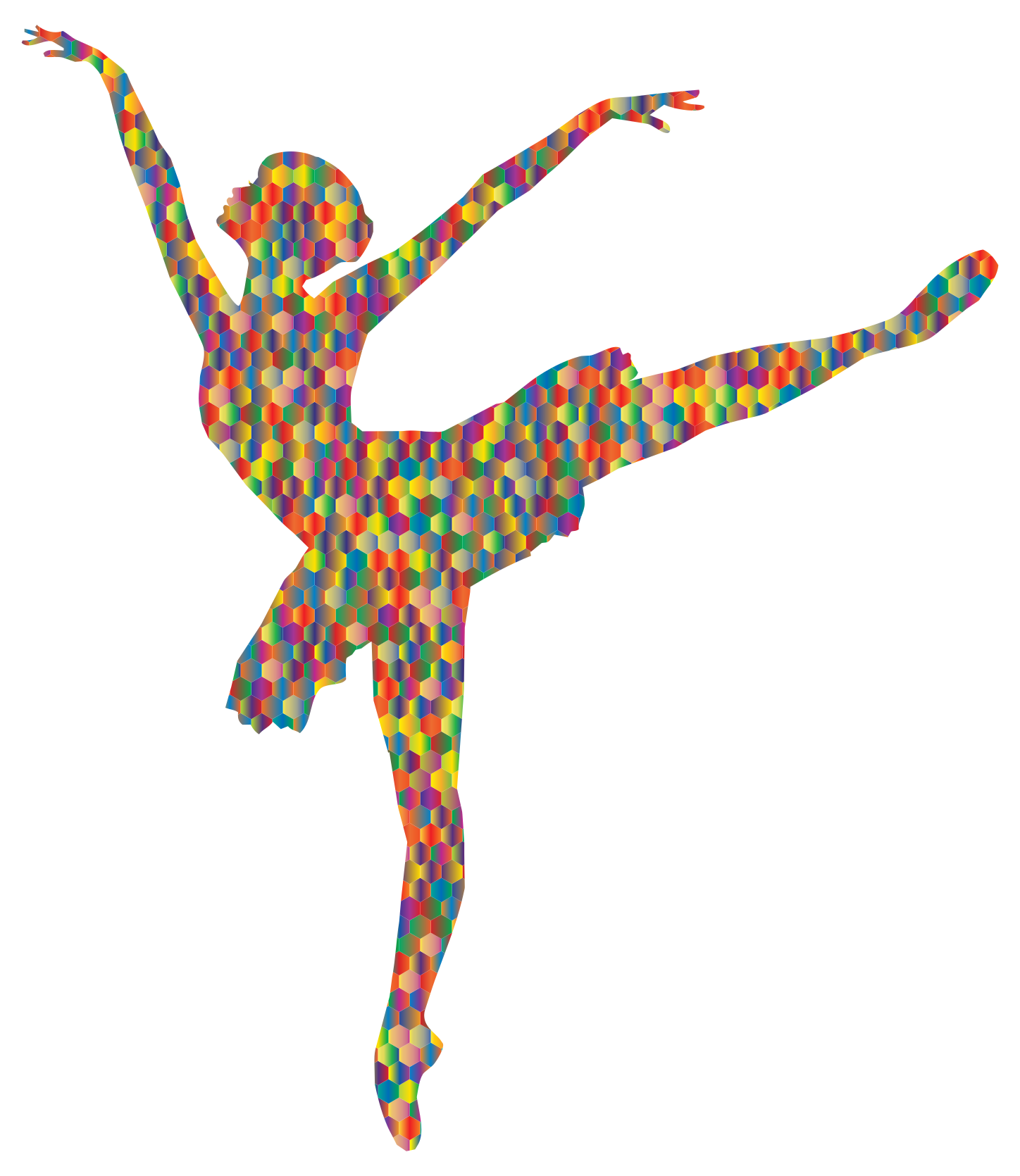 This features a colorful silhouette of a woman in a ballet pose. She is wearing a leotard and pointe shoes, which are visible on her feet. Her arms are raised above her head as she performs the dance move. The background is white, providing a stark contrast to the vibrant colors of the dancer's outfit. This artistic representation captures the grace and elegance of ballet dancers in motion.
