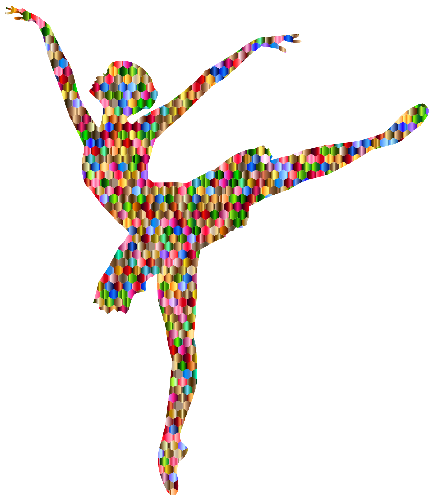 This features a beautifully colored silhouette of a woman in a ballet pose. She is wearing a leotard and pointe shoes, which are the traditional attire for ballerinas. Her body is adorned with colorful shapes that create an artistic and visually appealing effect. The colors used to represent her form include red, blue, green, yellow, orange, purple, pink, and white. This unique representation of a dancer in motion showcases the beauty and grace associated with ballet performances.