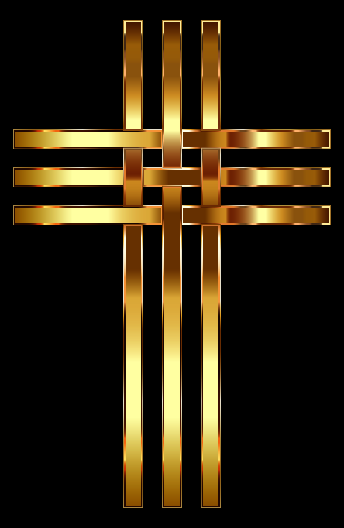 This features a large, ornate cross made of gold and black materials. The cross is prominently displayed in the center of the scene, with its golden elements contrasting against the dark background. The design of the cross includes multiple interconnected bars, giving it an intricate and eye-catching appearance. This striking piece of artwork serves as a focal point for any space where it is placed.