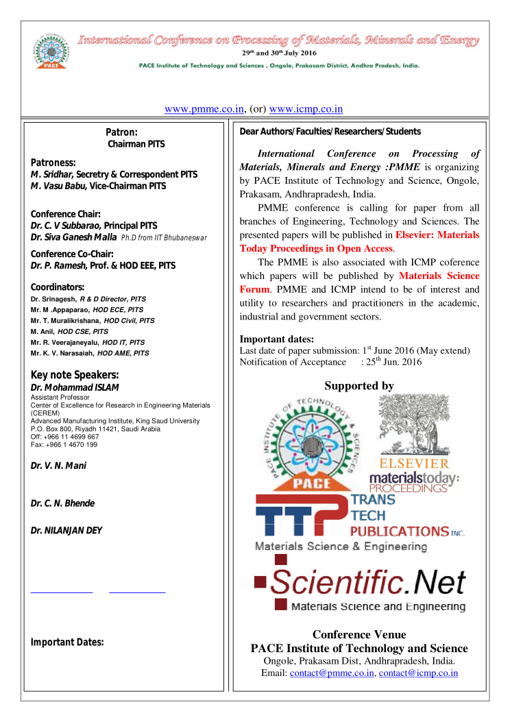This is a flyer for an International Conference on Materials and Energy. It features a picture of the conference logo, which includes a globe and a tree. The flyer also has a list of speakers who will be presenting at the conference, including Dr. C. M. Rao, Dr. S. K. Sahu, and Dr. B. L. Nayak. The flyer is written in both English and Spanish, indicating that it is an international event. The conference is being held from May 26 to 28, 2017 at the Indian Institute of Technology (IIT) in Kharagpur, India. The event aims to bring together researchers, scientists, engineers, and students to discuss advancements in materials and energy.
