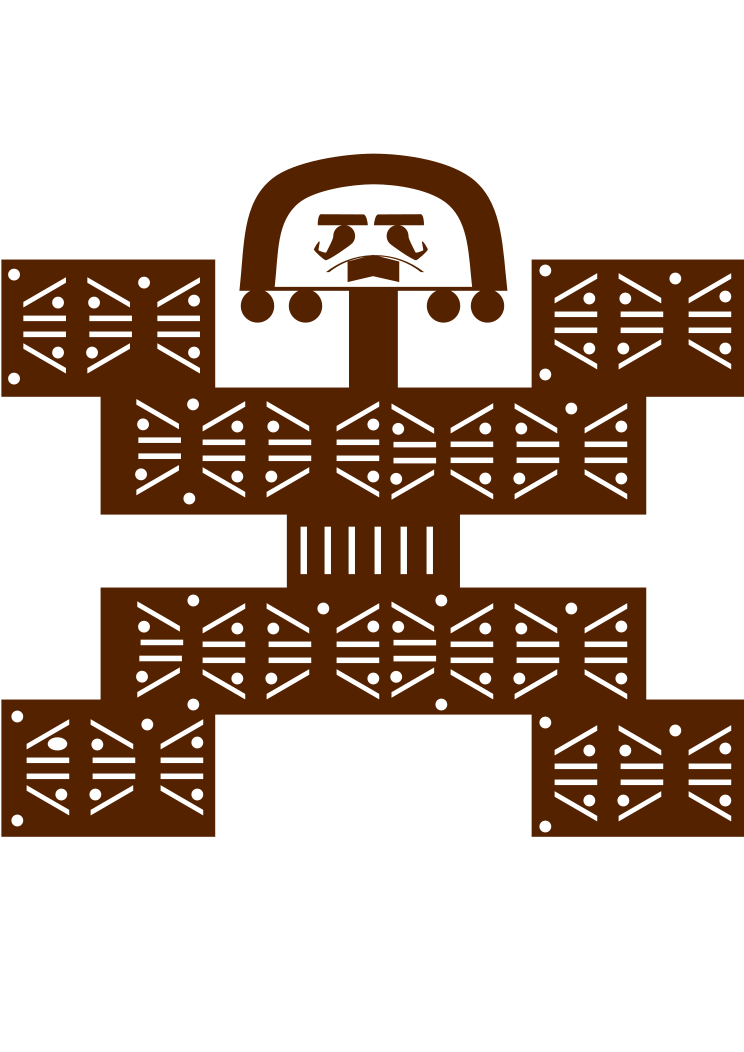This features a unique and intricate design, which appears to be an artistic representation of a head. This head is placed on top of a stick or pole, giving it the appearance of being held up by the neck. The overall design has a brown color scheme with white lines and circles adding contrasting elements to the piece. The combination of these geometric shapes creates a visually striking image that captures attention and showcases the artist's skill in crafting such an intricate pattern.