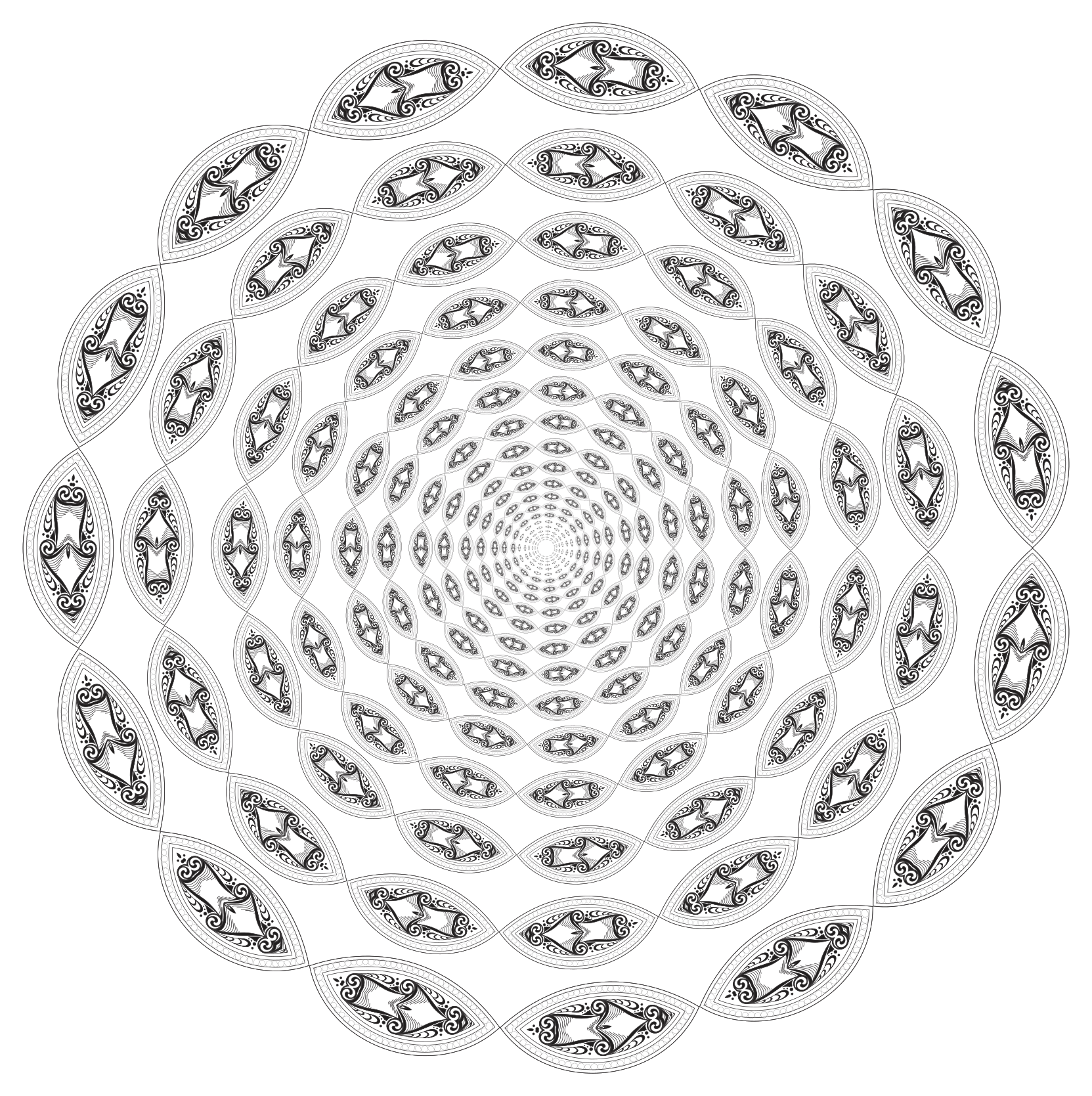 This features a large, intricate design made up of many small circles. Each circle is filled with an eye-like pattern, creating a visually striking and unique piece of artwork. The circles are arranged in a circular formation, giving the impression of a spiral or a swirling pattern. This creative composition showcases the artist's skill in crafting intricate patterns using simple shapes, resulting in a captivating visual experience for viewers.
