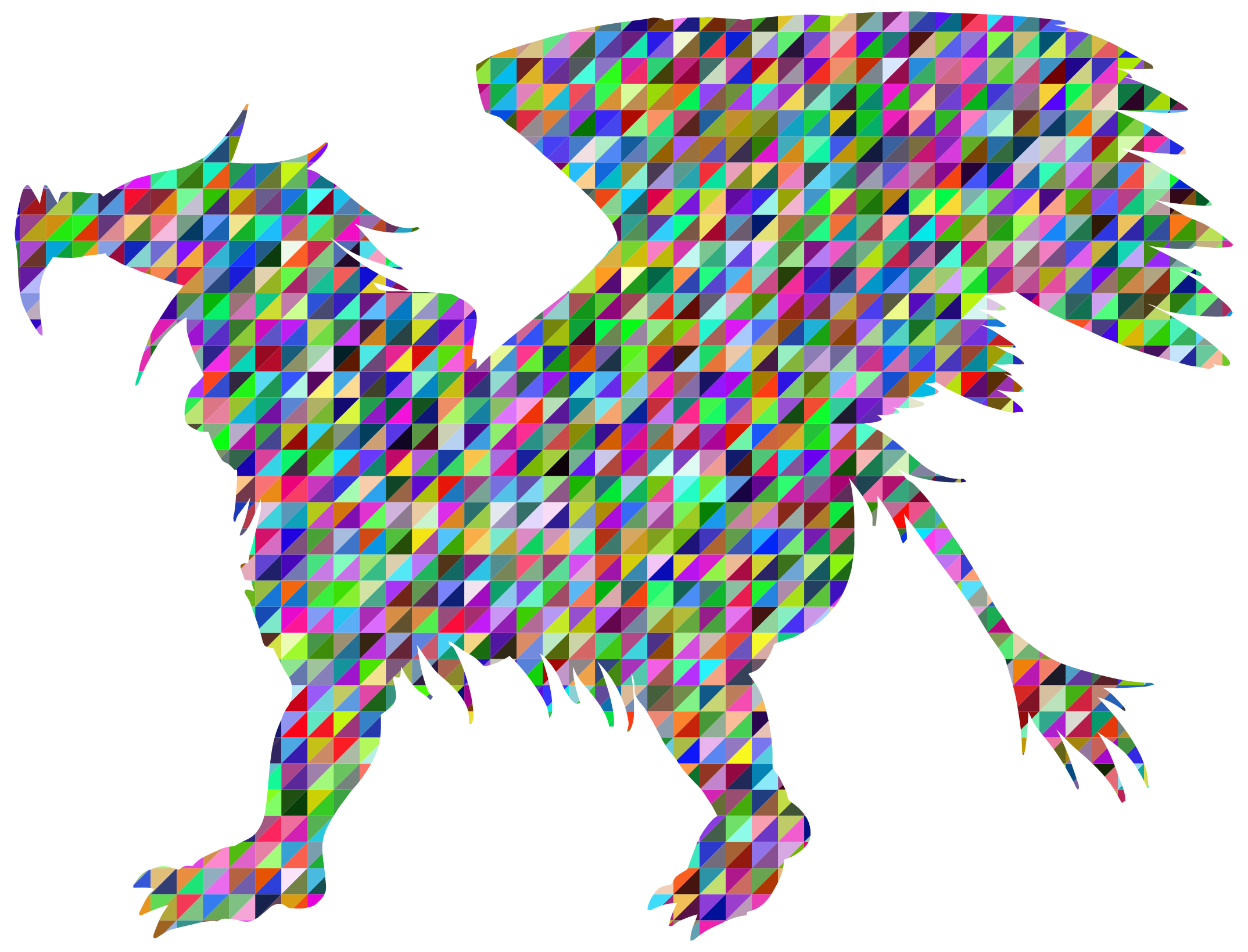 This features a colorful, abstract representation of a griffin. This mythical creature is depicted in a silhouette form with its body made up of small, colorful triangles. The griffin's wings are spread wide, giving the impression that it is flying or soaring through the air. The vibrant colors and unique design make this image visually striking and intriguing.
