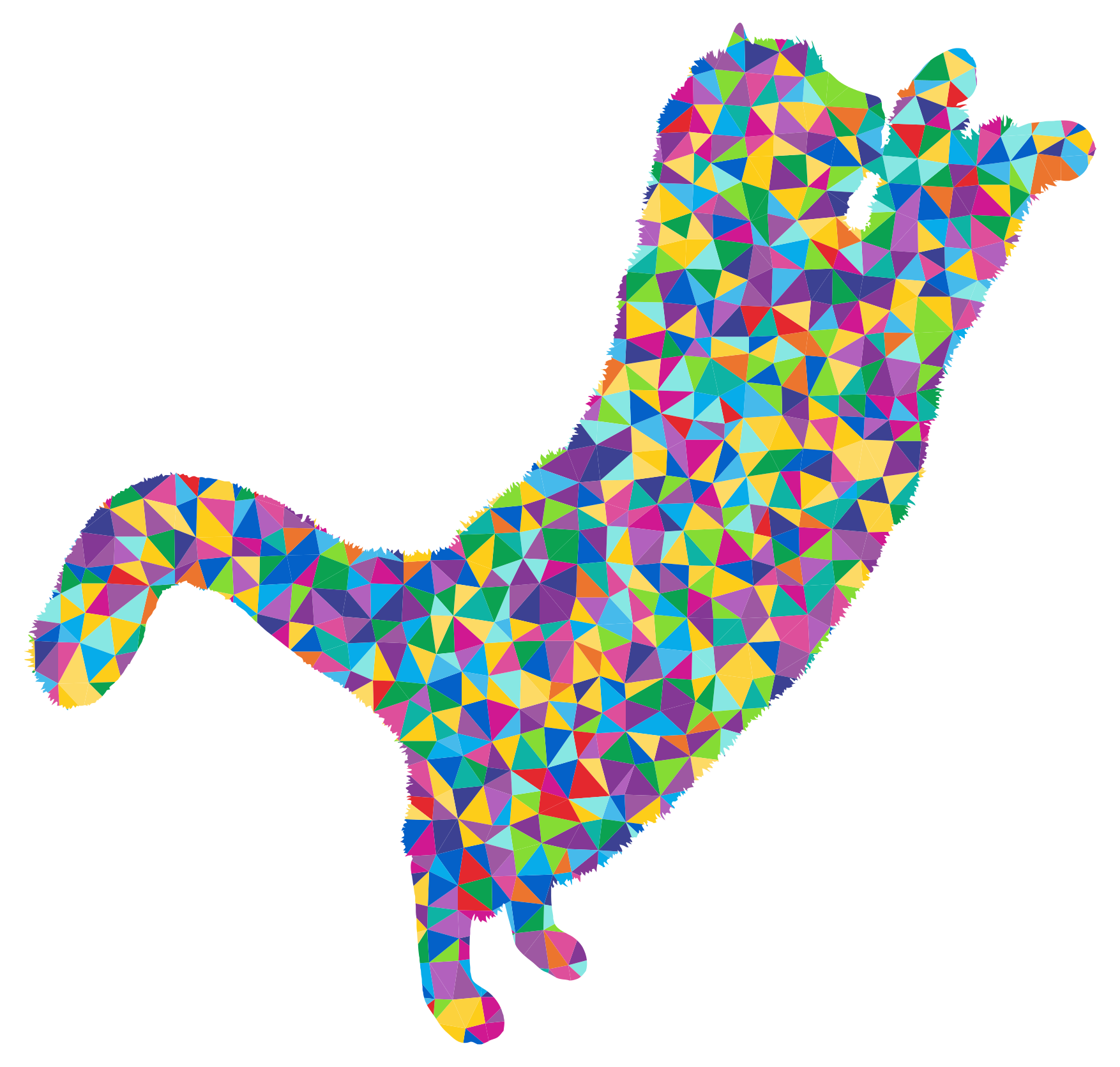 This features a colorful cat with its back legs up in the air, giving it an energetic and playful appearance. The cat is made up of various colors, including red, blue, green, yellow, and purple, creating a vibrant and lively scene. The cat's body is covered in these different colors, making it stand out against the white background. This unique and eye-catching image captures the essence of a playful feline in motion.