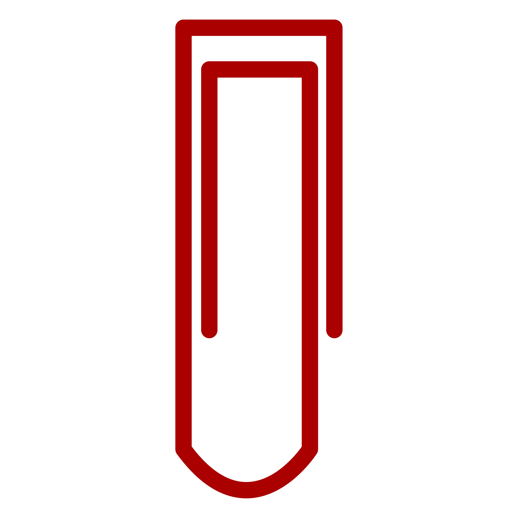 This features a red paper clip with a square top, which is an iconic symbol for office supplies. It is a simple and minimalist representation of the item, focusing on its primary shape and color. The red hue adds a bold and eye-catching element to the design, making it stand out against various backgrounds or other objects. This paper clip could be used in a variety of contexts, such as presentations, diagrams, or even as an emblem for a company that specializes in office supplies.