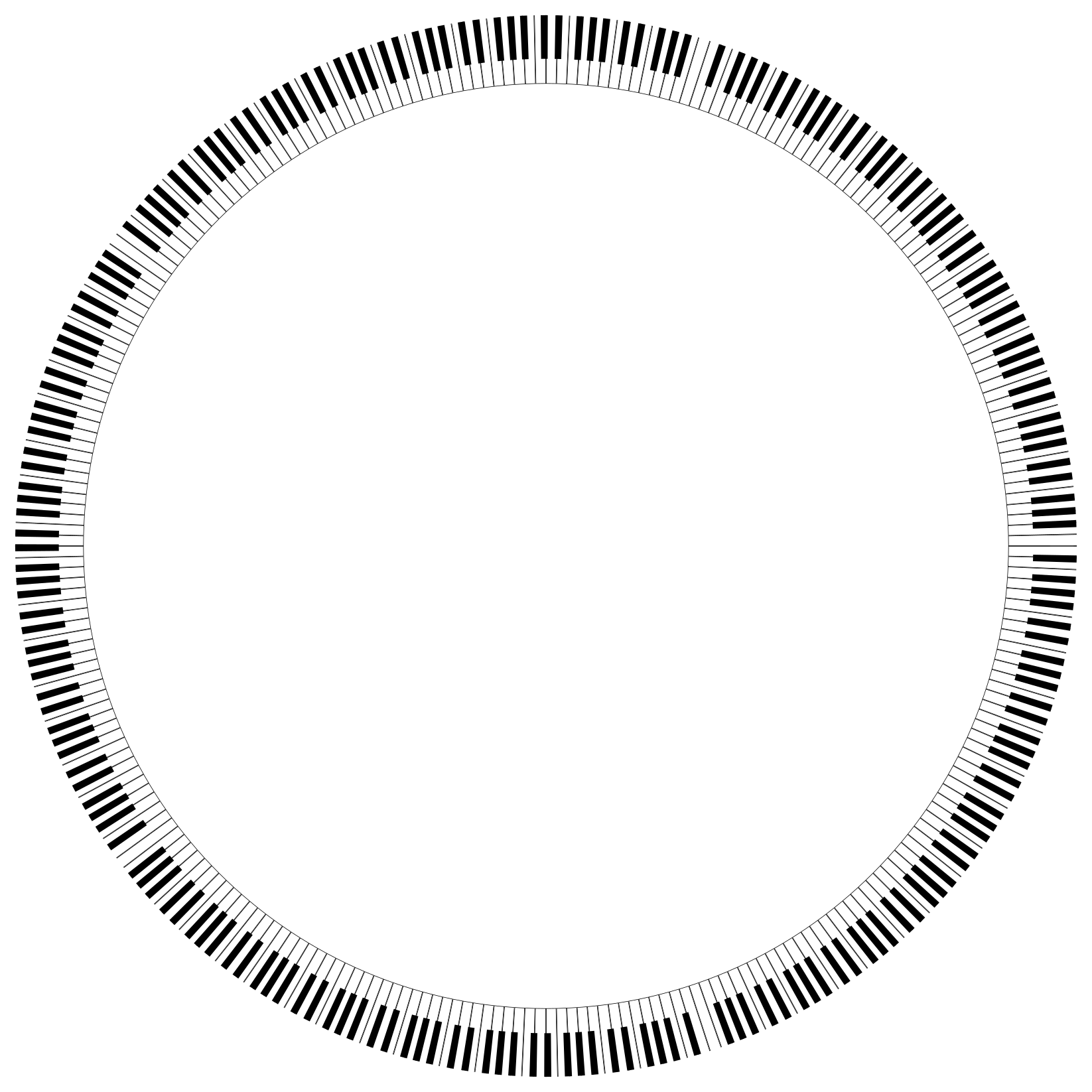 This features a large circle with a pattern of black and white piano keys. The circle is filled with these keys, creating an interesting visual effect. The keys are arranged in various positions around the circle, giving it a unique appearance. This design could be used for decorative purposes or as a creative art piece that showcases musical elements.