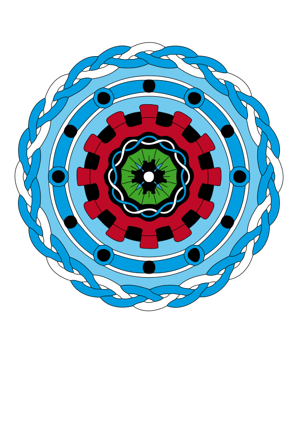 This features a colorful and intricate mandala design, which is an abstract art piece. The mandala has a white and blue knot as its outline, with the center of the design being red in color. In the middle of the mandala, there is a round green circle that adds to the overall visual appeal of the piece. The combination of colors and shapes creates a captivating and visually striking image.