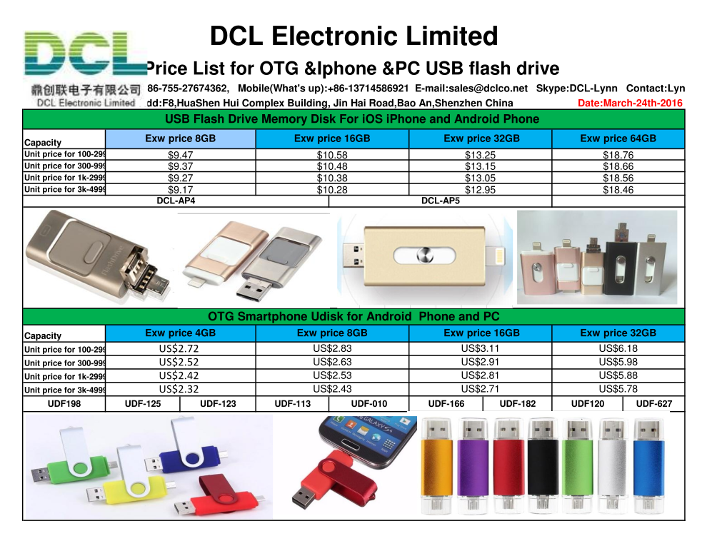 This displays a table with various electronic devices, including cell phones and USB drives. There are several cell phones of different sizes and colors arranged on the table, as well as multiple USB drives in different shapes and sizes. Some of these items are placed near each other, while others are spread out across the table. The table appears to be a price list for these electronic devices, with prices listed next to each item. This display showcases an array of electronic products available for purchase.