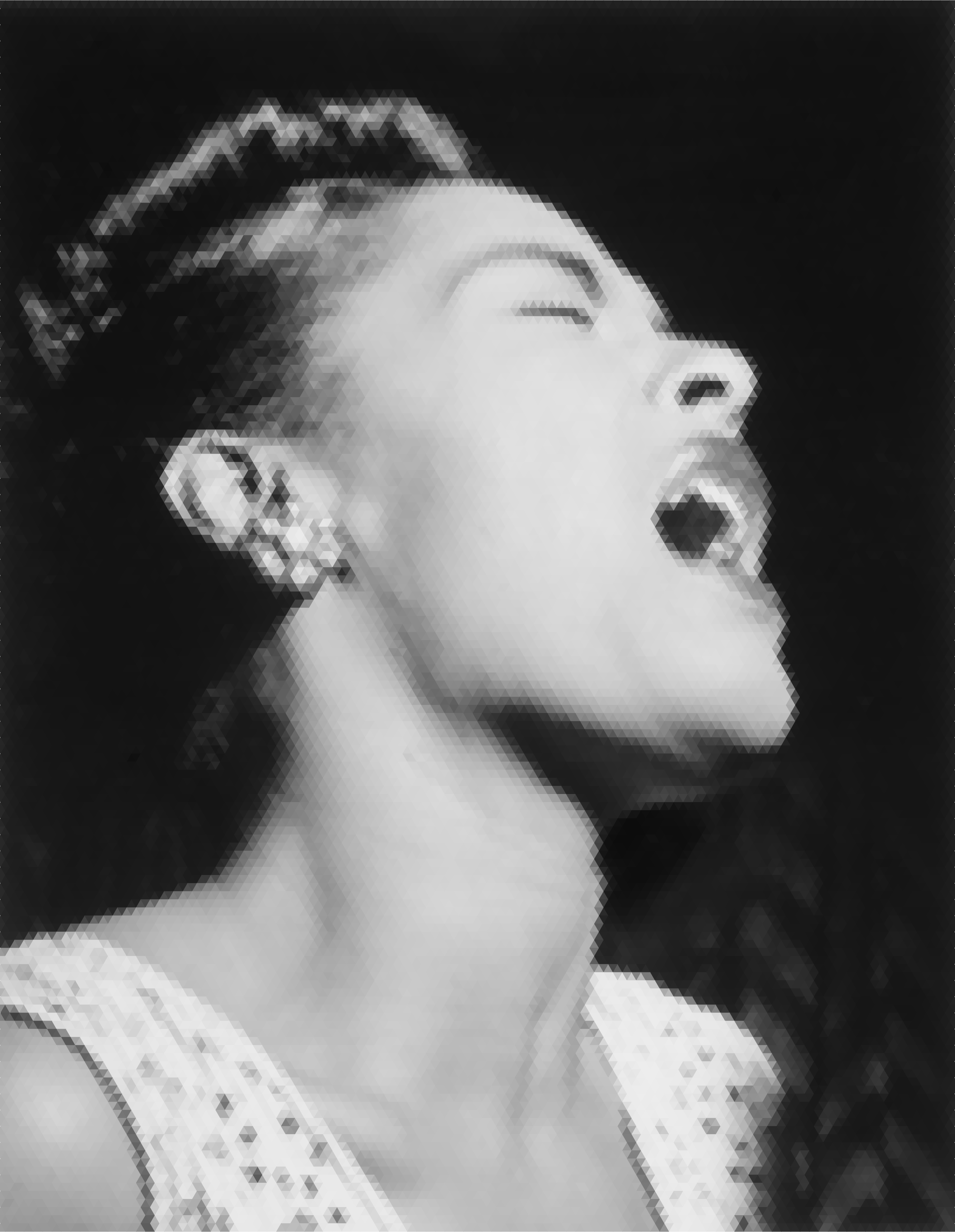 Tags: celebrity, entertainer, famous-people, female, grayscale, mosaic, musician, photograph, polygon, portrait, semi-realistic people, singer, triangle, woman, black and white, singing, mouth open