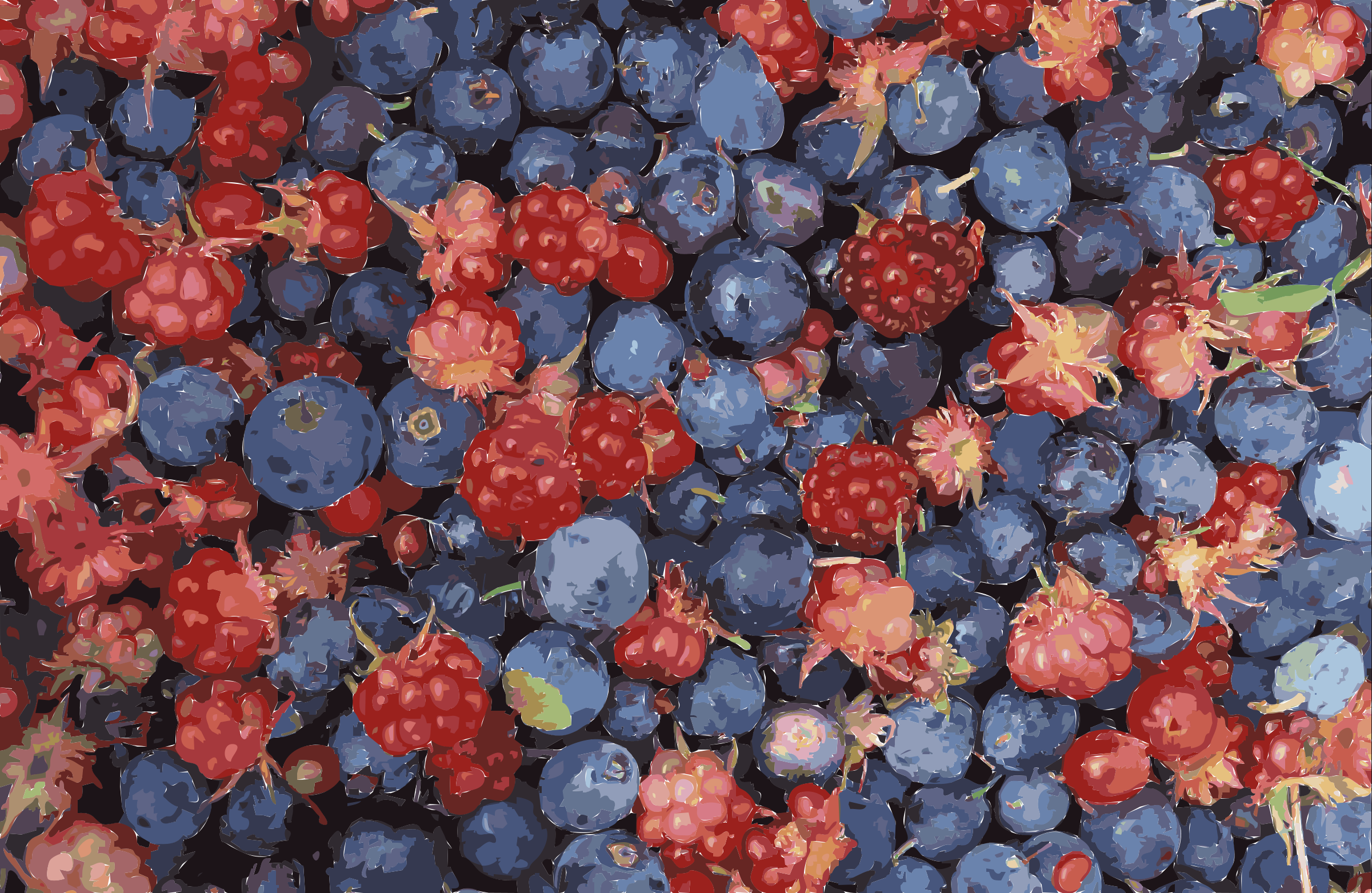 This features a close-up of a large group of red and blue berries, likely raspberries or blueberries. These berries are arranged in various clusters throughout the scene, with some appearing larger than others. They are spread across the entire frame, creating an eye-catching display of colorful fruit. The berries are placed on a surface that appears to be a table, providing a visually appealing presentation of these delicious fruits.