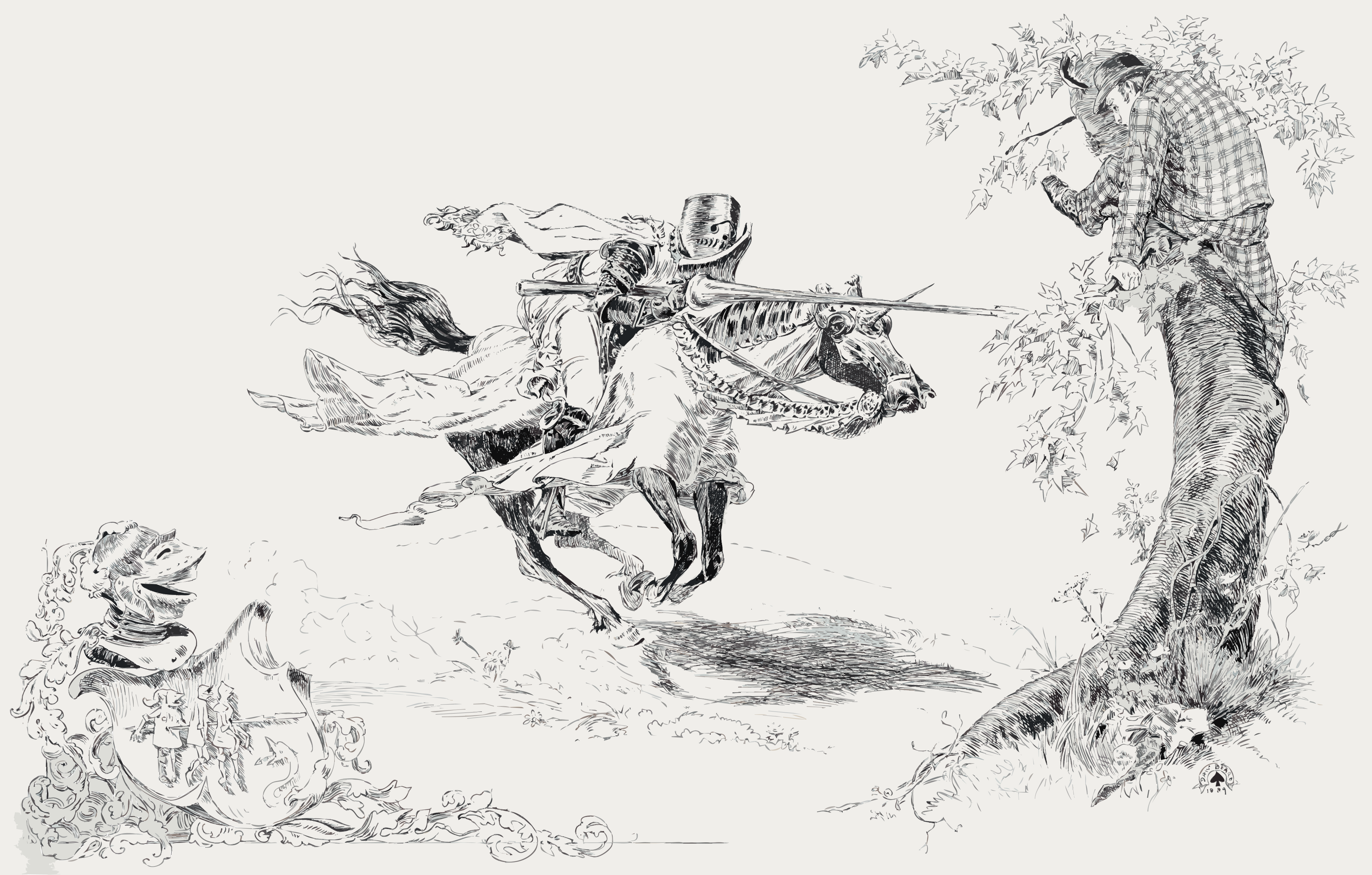 This features a man riding a horse in the middle of an open field. The man is holding a gun, possibly preparing to shoot at something or someone. Another person can be seen standing near a tree on the right side of the scene. There are also two dogs present in the picture, one located closer to the left edge and another further back towards the center. The overall atmosphere suggests an outdoor adventure or hunting activity.
