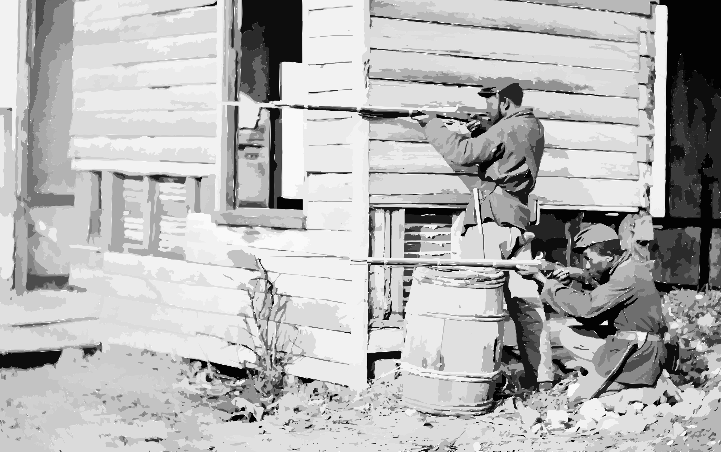 This is a black and white photo of two men standing in front of a cabin. One man appears to be holding a gun, while the other man has a rifle. They seem to be posing for the picture or possibly preparing for some sort of activity. In addition to the men, there are several objects around them that add context to their surroundings. A barrel is located near the center of the image, and two potted plants can be seen on either side of the cabin. There is also a chair placed in front of the cabin, possibly for someone to sit down while enjoying the outdoor setting.