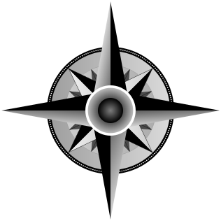 This features a black and white compass with a circle in the center. The compass is surrounded by four smaller circles, each one located at the corner of the compass. This design gives the impression that it's an old-fashioned compass, possibly used for navigation purposes. The overall appearance of the image suggests a sense of history and tradition, as well as a connection to the world of cartography and exploration.