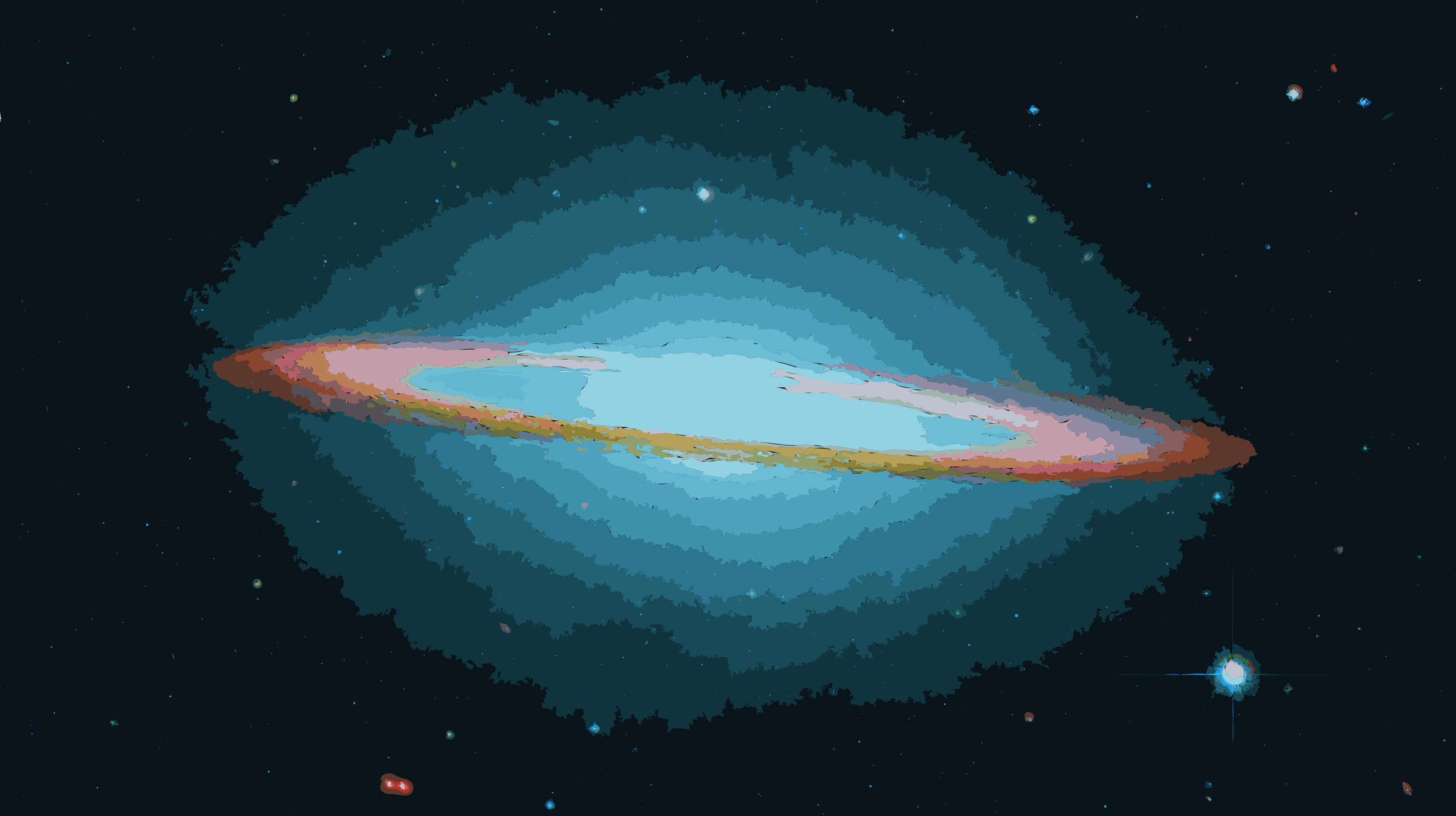 This features a large, colorful spiral galaxy with a blue and white hue. It is surrounded by numerous stars of various sizes, creating an impressive display in the night sky. The galaxy appears to be at the center of attention, drawing the viewer's eye towards it. The stars are scattered throughout the image, some closer to the foreground while others are further away, giving a sense of depth and dimension to the scene.