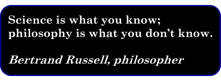 This features a quote from the philosopher Bertrand Russell. It reads, "Science is what you know, philosophy is what you don't know." This statement suggests that science relies on knowledge and facts, while philosophy explores the unknown and unknowable aspects of life. The quote is displayed in black text against a dark background, making it easy to read and understand.