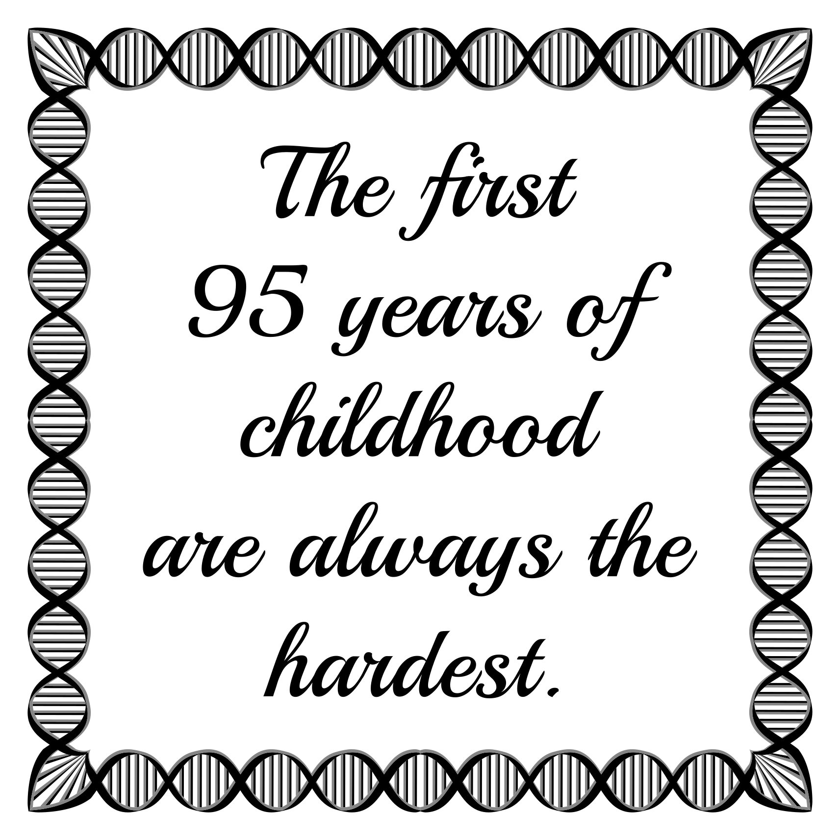 This features a poster with a DNA frame, which is the central focus of the picture. The text on the poster reads "The first 95 years of childhood are always the hardest," emphasizing the challenges that come with growing up and maturing into adulthood. The black and white color scheme adds an artistic touch to the design, making it a visually appealing piece for display or sharing on social media platforms.