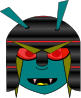 This features a cartoon character with an angry expression. This character has large, pointy ears and is wearing a blue helmet. The character's eyes are glowing red, giving it a menacing appearance. The character appears to be a mix of human and animal features, making for an interesting and unique design.