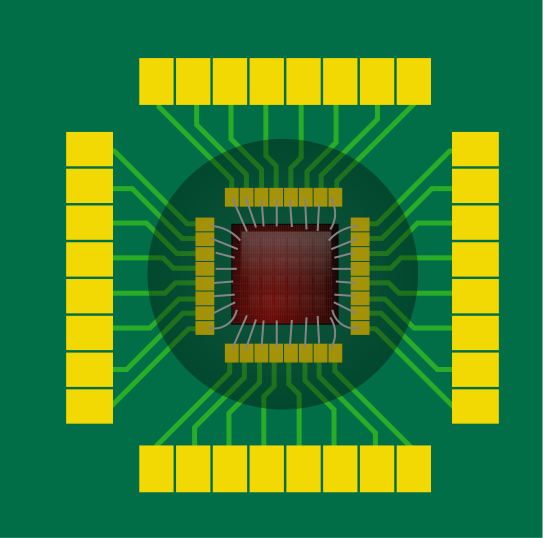 This features a close-up of an electronic component, possibly a computer chip or a memory unit. It is surrounded by numerous yellow lines that create a complex pattern on the green background. These yellow lines are intertwined and appear to be part of the electronic component's design. The intricate pattern adds visual interest to the image, highlighting the details of the electronic component.