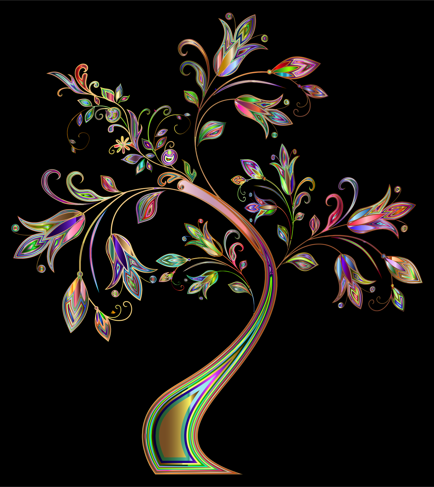 This features a tree with many branches and leaves, all in vibrant colors. The tree is adorned with various decorations such as flowers and butterflies, adding to its visual appeal. The tree's branches are curved and twisted, creating an interesting shape that stands out against the black background of the image. The combination of the tree's natural beauty and the added decorations make this a striking and eye-catching piece of artwork.