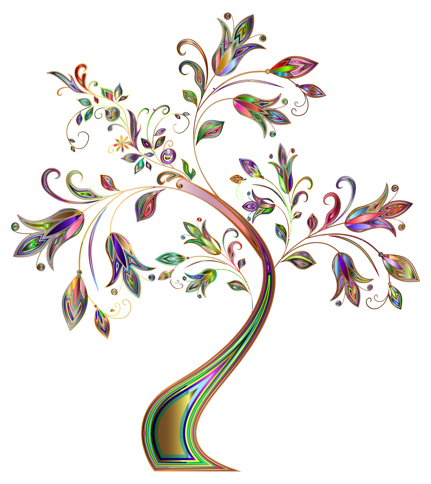 This features a vibrant, colorful tree with an ornate design. It has a long curved stem and is adorned with many leaves in various shades of pink, green, yellow, blue, and orange. These leaves are arranged in a way that creates a sense of depth and dimension to the tree's structure. The overall effect is a visually striking and artistic representation of nature.