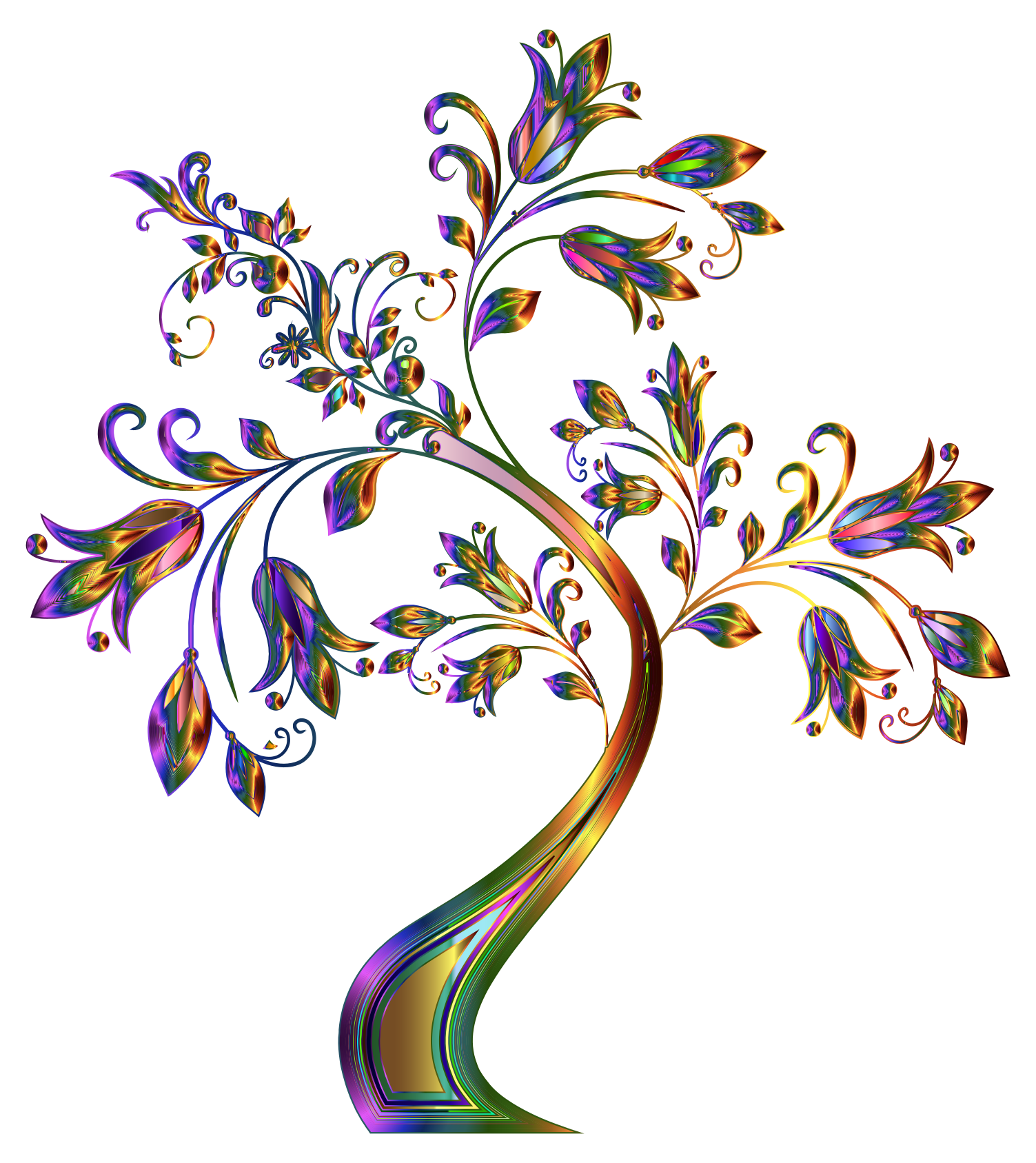 This features a tree with many branches and leaves, all in vibrant colors. The tree is depicted as having a long trunk, giving it an artistic appearance. The leaves are arranged in various positions on the branches, creating a sense of depth and dimension to the scene. The overall effect is that of a lively, colorful forest landscape.