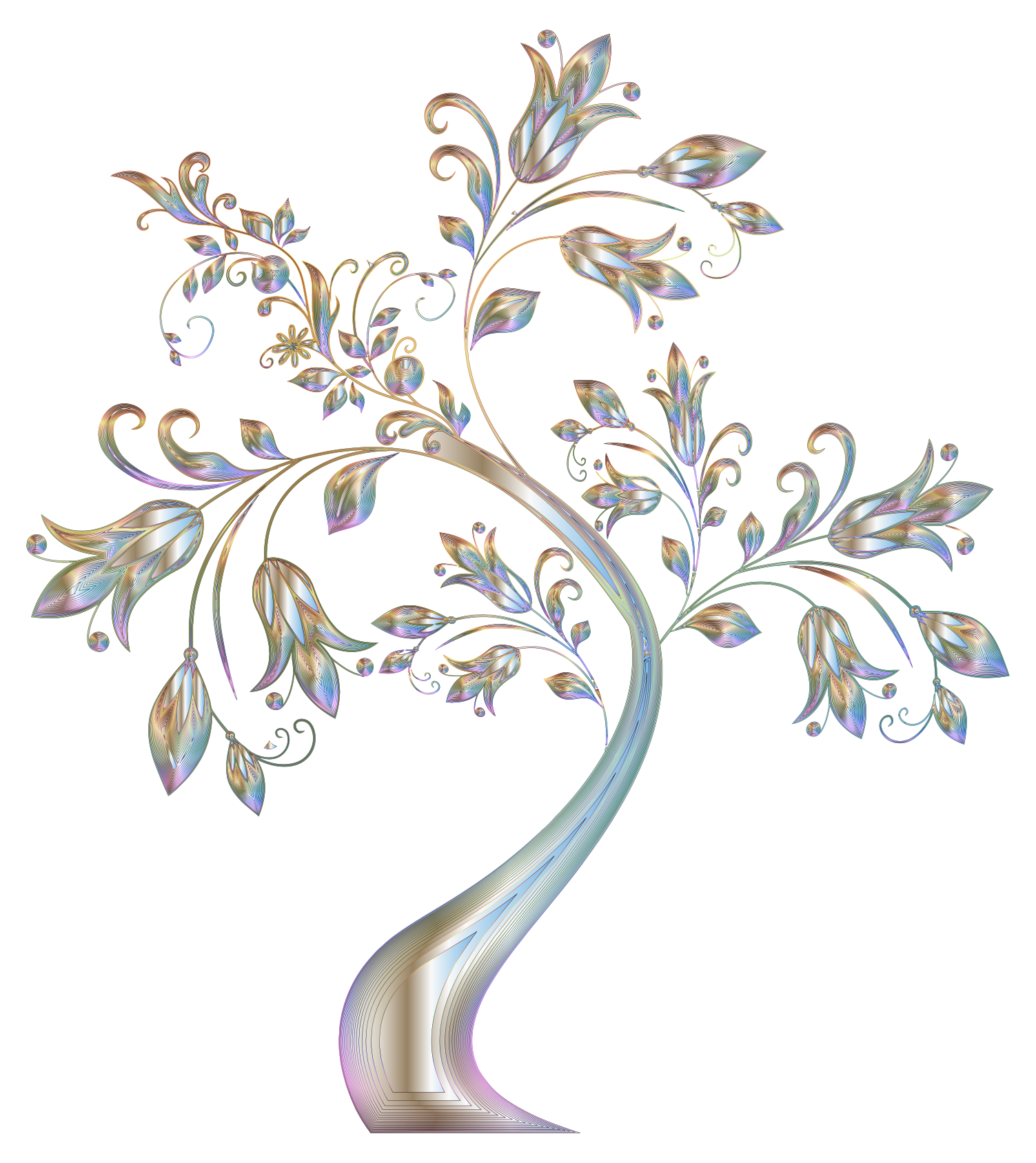 This features a beautifully designed tree with an ornate, curved stem. It is adorned with leaves and flowers, giving it a prismatic appearance. The tree's branches are intricately detailed, adding to its overall visual appeal. The combination of the tree's unique design and the vibrant colors make this image stand out as an artistic representation of nature.