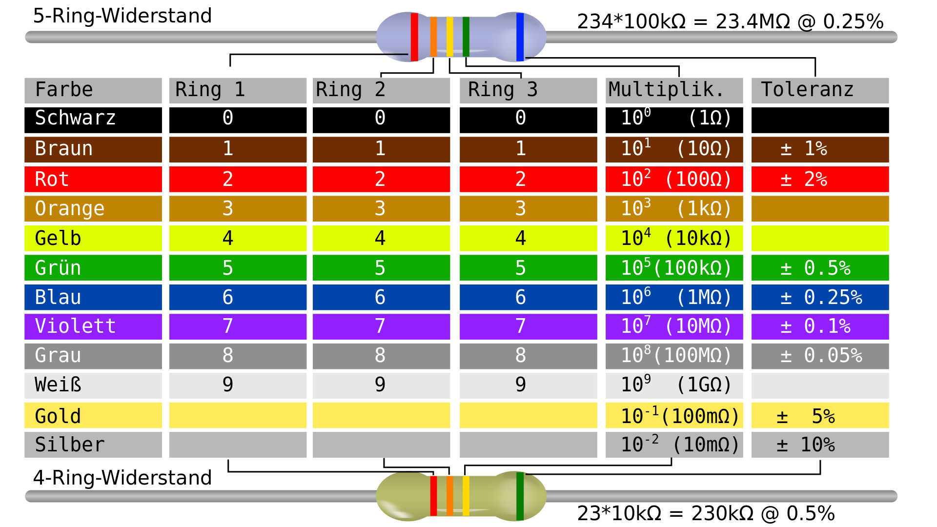 This displays a chart with various colors and numbers on it. It appears to be a color-coded chart, possibly showing different types of resistors or other electronic components. There are two resistors visible in the image - one at the top and another at the bottom. The chart is organized in such a way that each number corresponds to a specific color, making it easy for users to identify and understand the information presented on the chart.