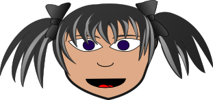 This features a cartoon character with black hair and purple eyes. She has two pigtails in her hair, giving her a playful appearance. The girl is smiling, which adds to the cheerful nature of the scene. Her facial expression suggests that she might be enjoying herself or engaging in some form of entertainment. Overall, this cartoon character exudes a sense of fun and lightheartedness.
