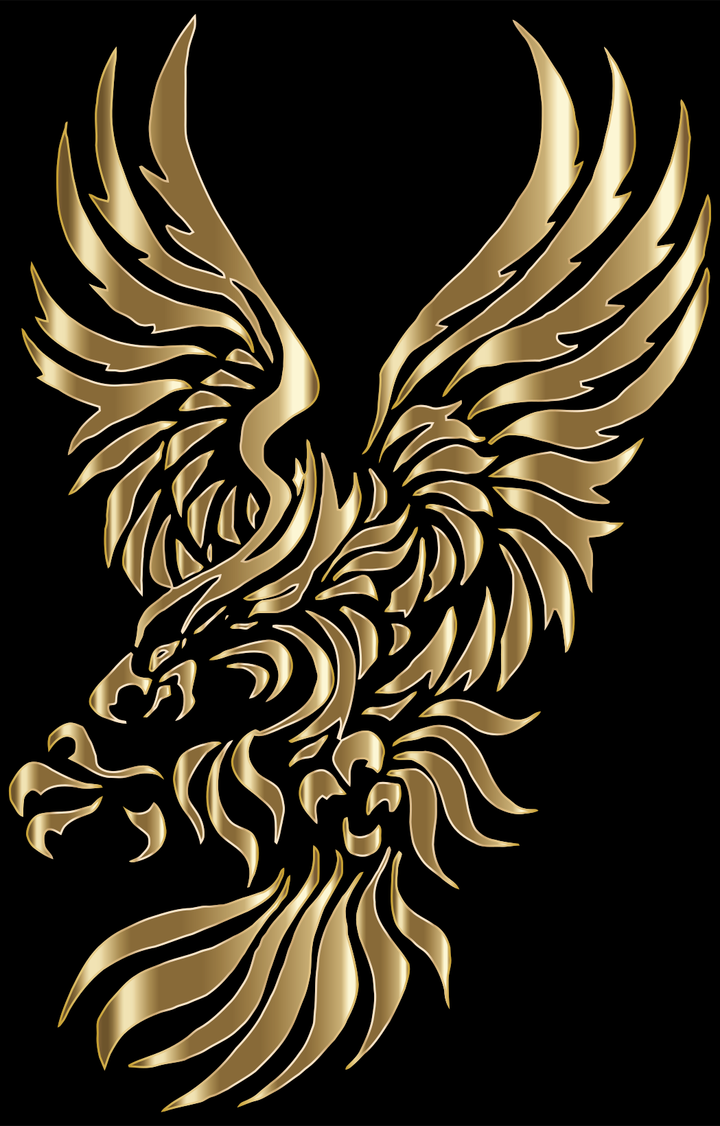 This features a large, intricate golden eagle with its wings spread wide. The bird is the central focus of the scene and appears to be in flight or ready for takeoff. The eagle's wings are adorned with gold accents, adding an elegant touch to the design. The overall appearance of the image gives off a sense of power and strength, as the majestic bird dominates the frame.