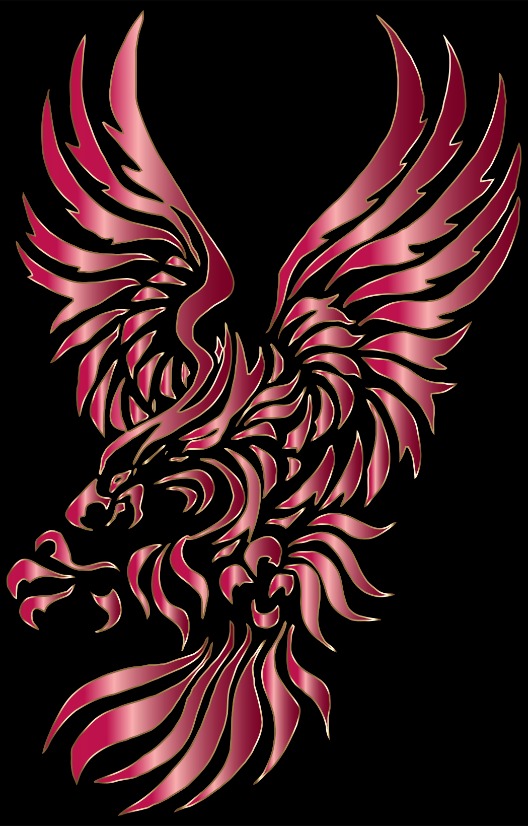 This features a large, intricately designed eagle with red and gold colors. The bird's wings are spread wide, showcasing its impressive size and detail. The design is reminiscent of a tribal tattoo or an emblem, making it visually striking and eye-catching. The eagle appears to be the central focus of the image, with no other objects or distractions visible in the frame.