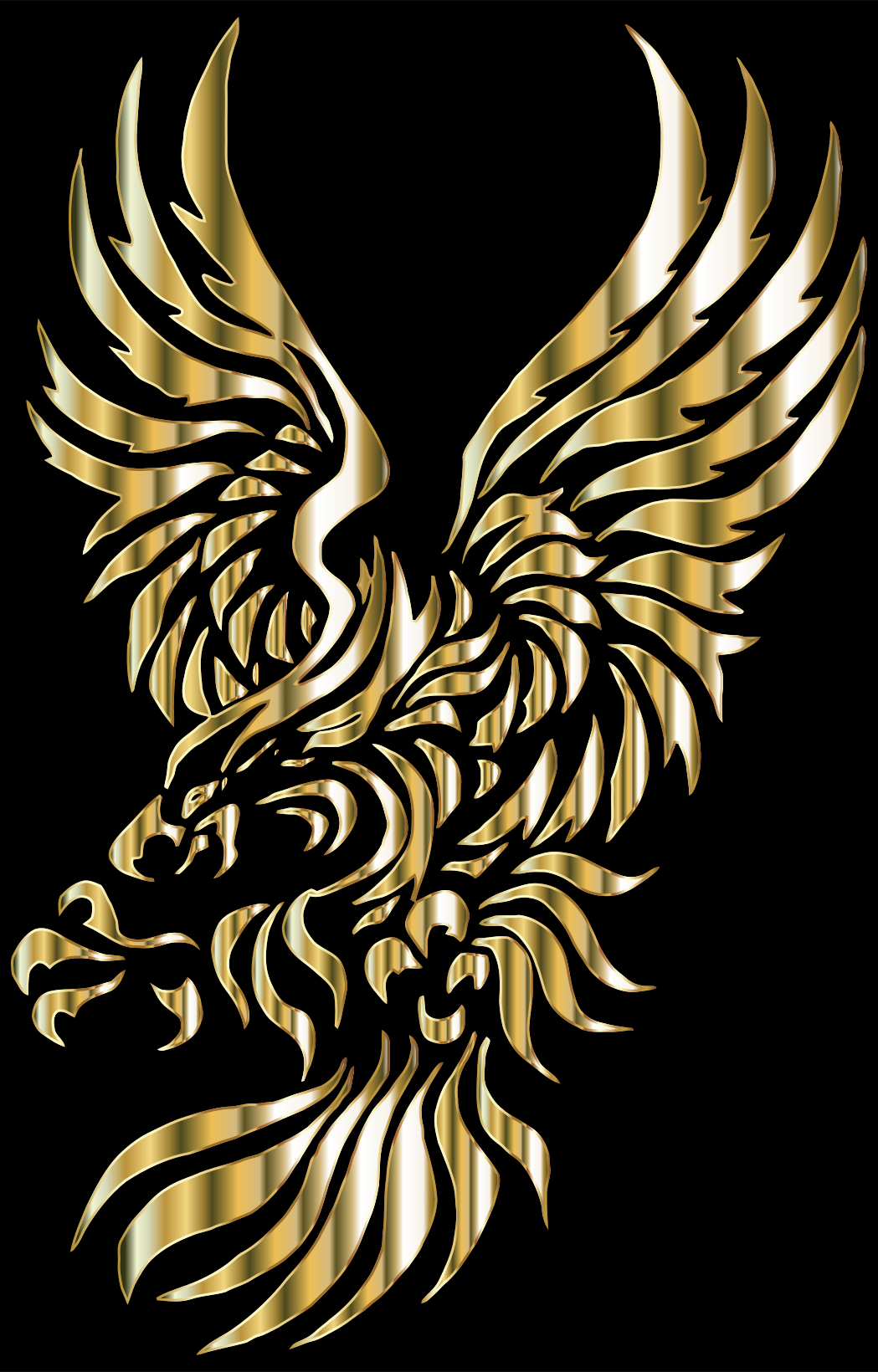 This features a large, intricately designed eagle with gold and black colors. The bird's wings are spread wide, showcasing its impressive size and strength. The eagle is positioned in the center of the image, drawing attention to its striking appearance. The design elements on the eagle include a beak, which adds detail and character to the overall look of the bird. This artistic representation of an eagle creates a powerful visual impact that captures the viewer's interest.