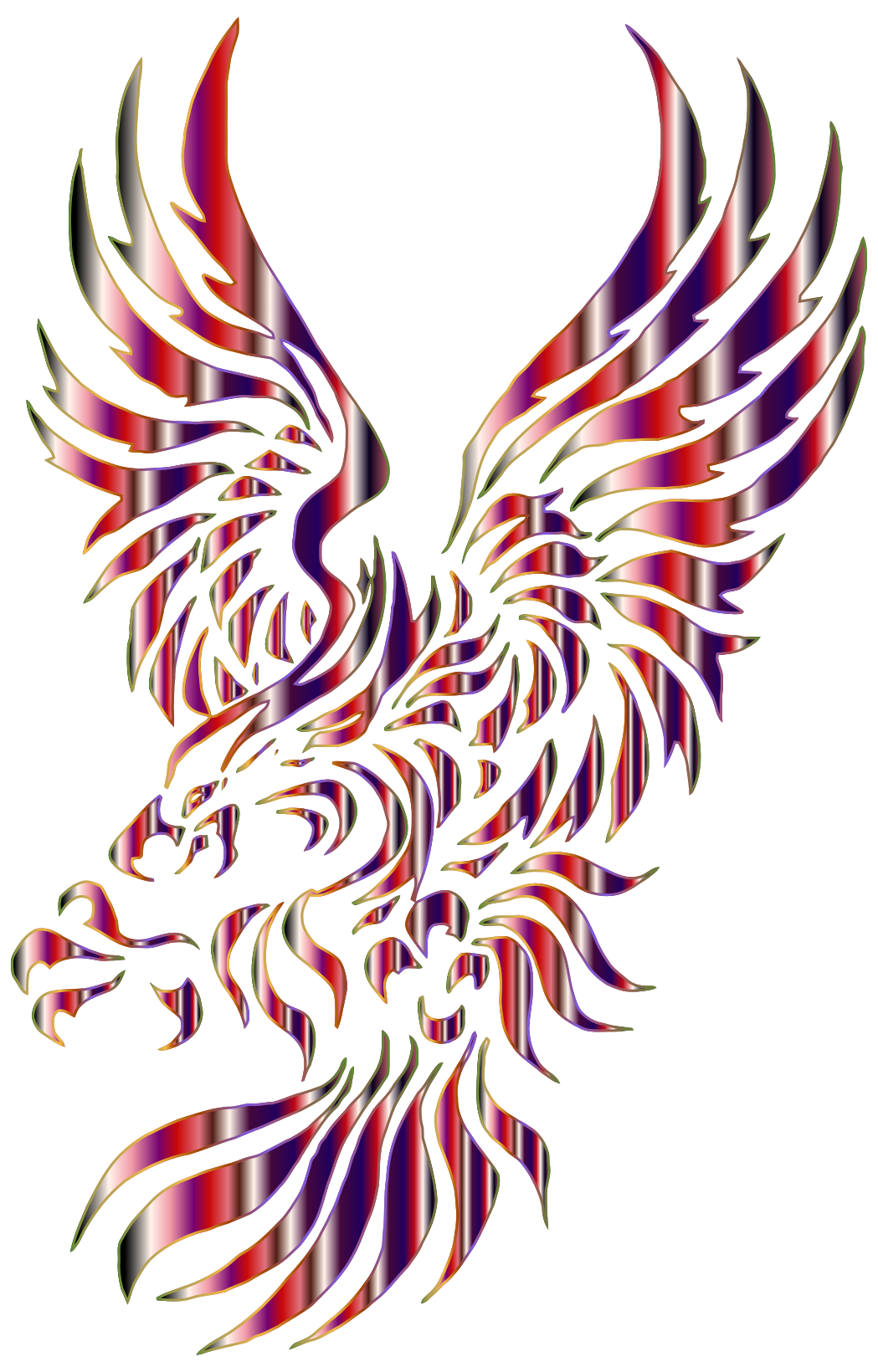 This features a colorful and intricate design of an eagle, with its wings spread wide. The eagle is depicted in red, white, and purple colors, giving it a vibrant appearance. Its wings are adorned with various patterns that add to the visual interest of the piece. The eagle's head is prominently displayed at the bottom left corner of the image, showcasing its sharp beak and piercing eyes. Overall, this artistic representation captures the majesty and beauty of the bird in flight.