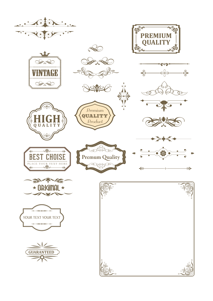 This showcases a collection of various vintage-style stickers and labels. These decorative items are arranged in an appealing manner, with some placed on top of each other or next to one another. They come in different shapes and sizes, adding visual interest to the overall composition. The stickers and labels feature a variety of text and designs, including words like "High Quality," "Best Choice," and "Premium." These labels suggest that the items are of high quality or have been carefully selected for their appeal. The collection appears to be well-organized and visually pleasing, making it an attractive display for viewers.