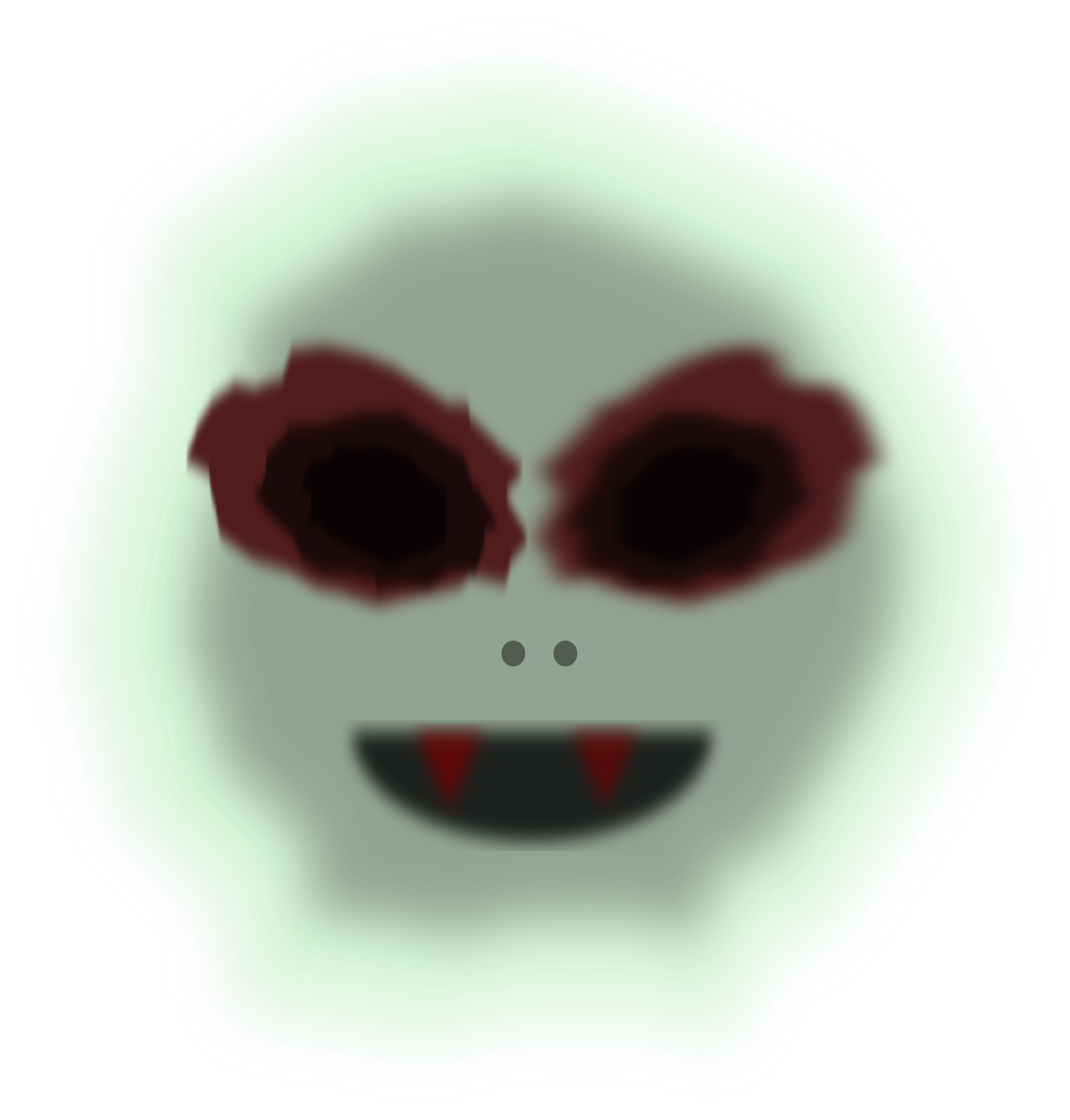 This features a close-up of an alien's head with a smile on its face. It has red fangs and is surrounded by a green background, giving it a unique appearance. The alien's eyes are black with a red outline, adding to the eerie nature of the creature. This image could be part of a science fiction or fantasy setting, where the alien might represent an evil character in a story.