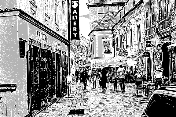 This is a black and white photo of a busy street in Bratislava, the capital city of Slovakia. There are several people walking on the sidewalk between shops and restaurants. Some individuals can be seen carrying handbags as they stroll along the street. A few chairs are also visible near some of the establishments, likely for outdoor seating or waiting areas. The overall atmosphere is lively and bustling with activity.