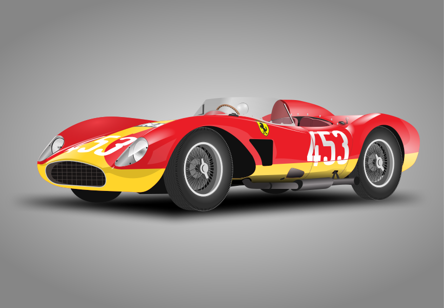This features a red and yellow sports car with the number 41 on it. It is parked in front of a gray background, giving it an old-fashioned appearance. The car has a Ferrari logo on its side, indicating that it's likely a vintage model. There are two tires visible, one on the left and another on the right side of the vehicle. Additionally, there is a steering wheel in the scene, which further emphasizes the sports car theme. The overall composition of the image creates an impression of a classic racing car from the past.