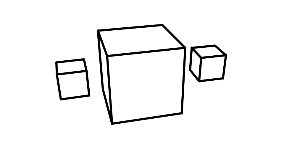 This features a simple illustration of three white cubes. The cube in the middle is larger than the other two, with one small cube placed to its right and another small cube on its left side. This arrangement creates an interesting visual effect that highlights the differences between the sizes of the cubes. The overall composition of the image gives a sense of depth and balance, making it an appealing representation of three-dimensional objects in two dimensions.