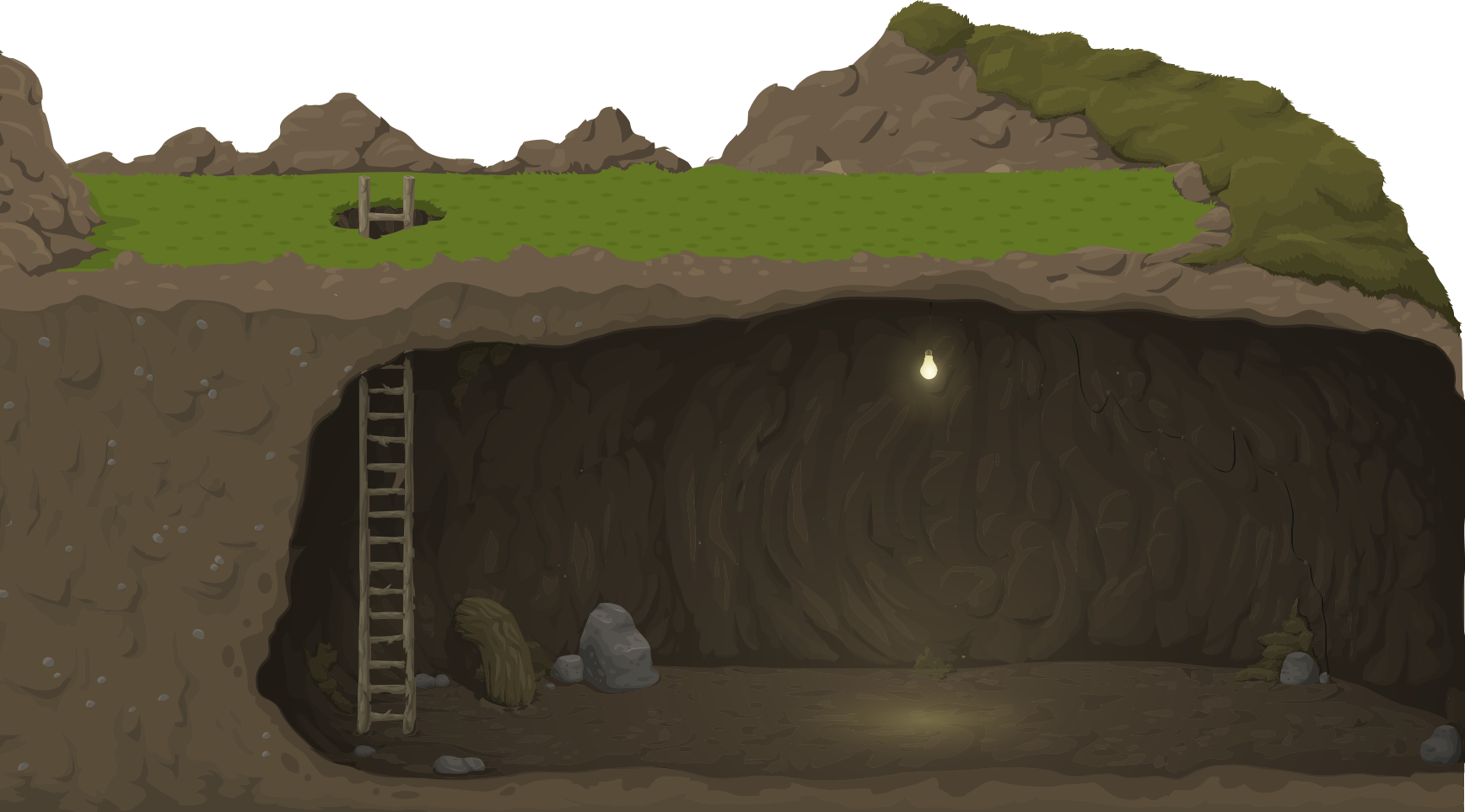 This features a cave with an underground shelter, which is accessed through a ladder. Inside the cave, there are several rocks scattered around, creating a natural and rugged atmosphere. A light can be seen in the distance, illuminating the area and providing some warmth to the space. This illustration showcases a unique perspective of an underground dwelling, giving viewers a glimpse into the world beneath our feet.