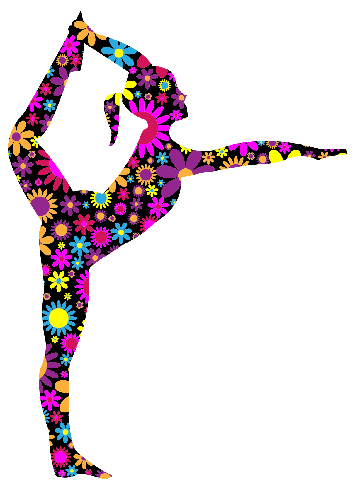 This features a colorful and artistic representation of a person doing yoga. This unique design showcases the individual in various poses, with their legs spread wide apart and arms raised high above their head. The background is white, providing a clean and uncluttered backdrop for this vibrant display. The overall effect is an eye-catching and creative representation of yoga practice.