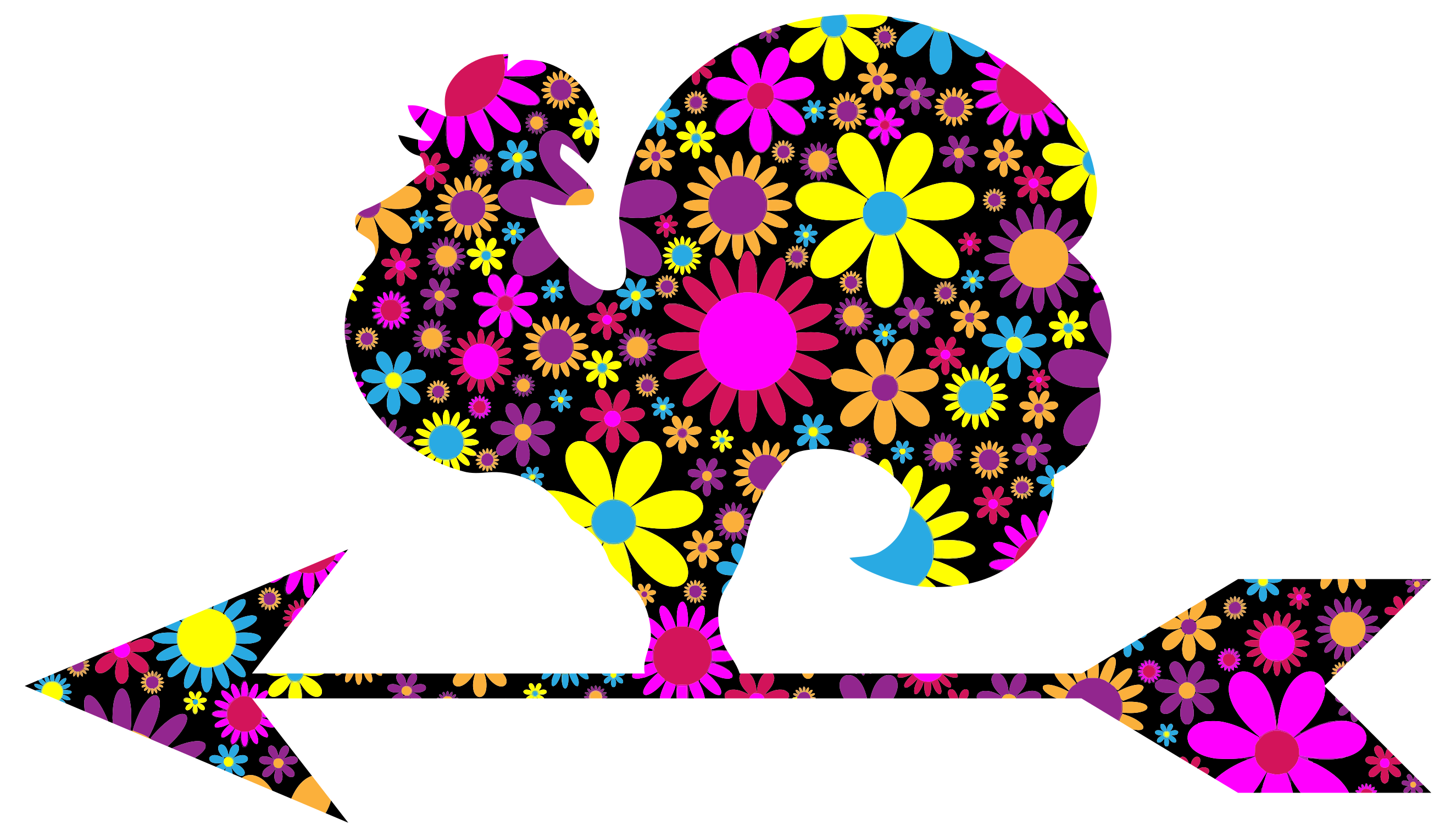 This features a colorful rooster standing on an arrow, which is pointing to the left. The rooster has a floral design and appears to be the main focus of the scene. The arrow itself is also decorated with flowers, adding to the overall vibrant and lively atmosphere of the picture. This unique combination of elements creates a visually appealing and eye-catching image that captures attention.
