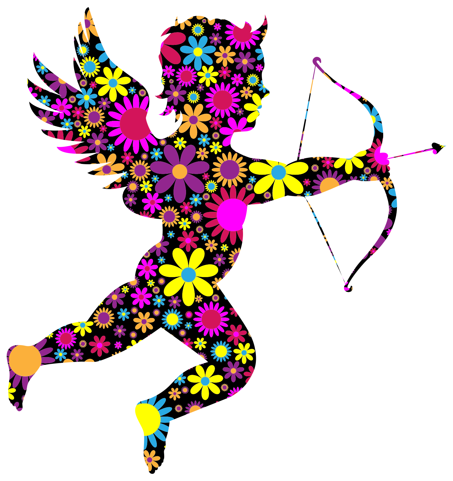 This features a colorful and artistic depiction of Cupid, the Roman god of love. He is shown holding a bow and arrow, ready to shoot his target. The background consists of various flowers that add to the vibrant and lively atmosphere of the scene. The flowers are scattered throughout the image, with some located near the top left corner, others in the middle section, and more towards the bottom right side. Overall, this artistic representation captures Cupid's essence while incorporating a visually appealing floral theme.
