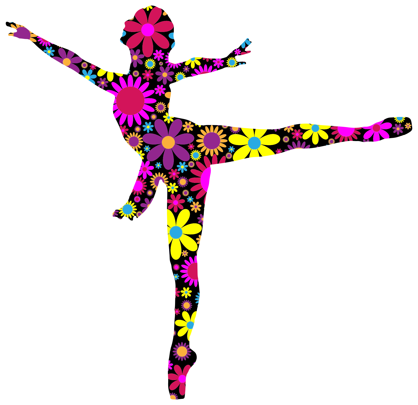 This features a colorful and artistic representation of a ballerina in mid-pose. She is wearing a flowery design on her body, which adds an interesting visual element to the scene. The ballerina's silhouette is prominently displayed against a white background, allowing the vibrant colors of the floral pattern to stand out. This unique and creative portrayal of a dancer showcases both her skill and the beauty of the artistic design.