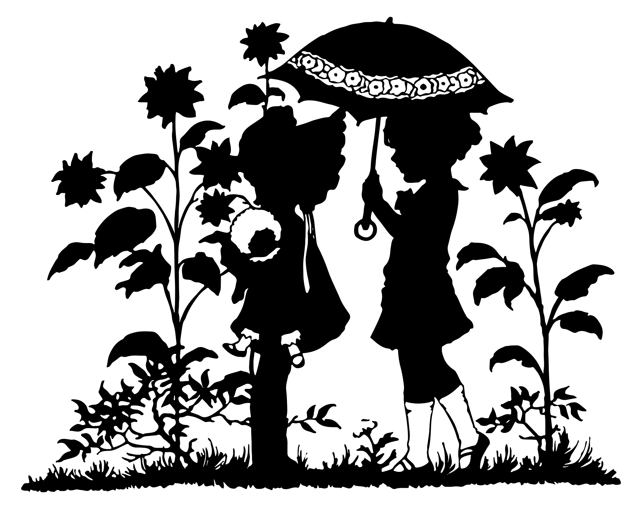 This features a silhouette of two children standing under an umbrella. They appear to be in a grassy garden with tall wildflowers surrounding them, creating a serene and peaceful atmosphere. One child is holding the umbrella above their head while the other stands beside them, both enjoying the outdoor setting. The scene captures a moment of togetherness between the two children as they share this beautiful experience in nature.